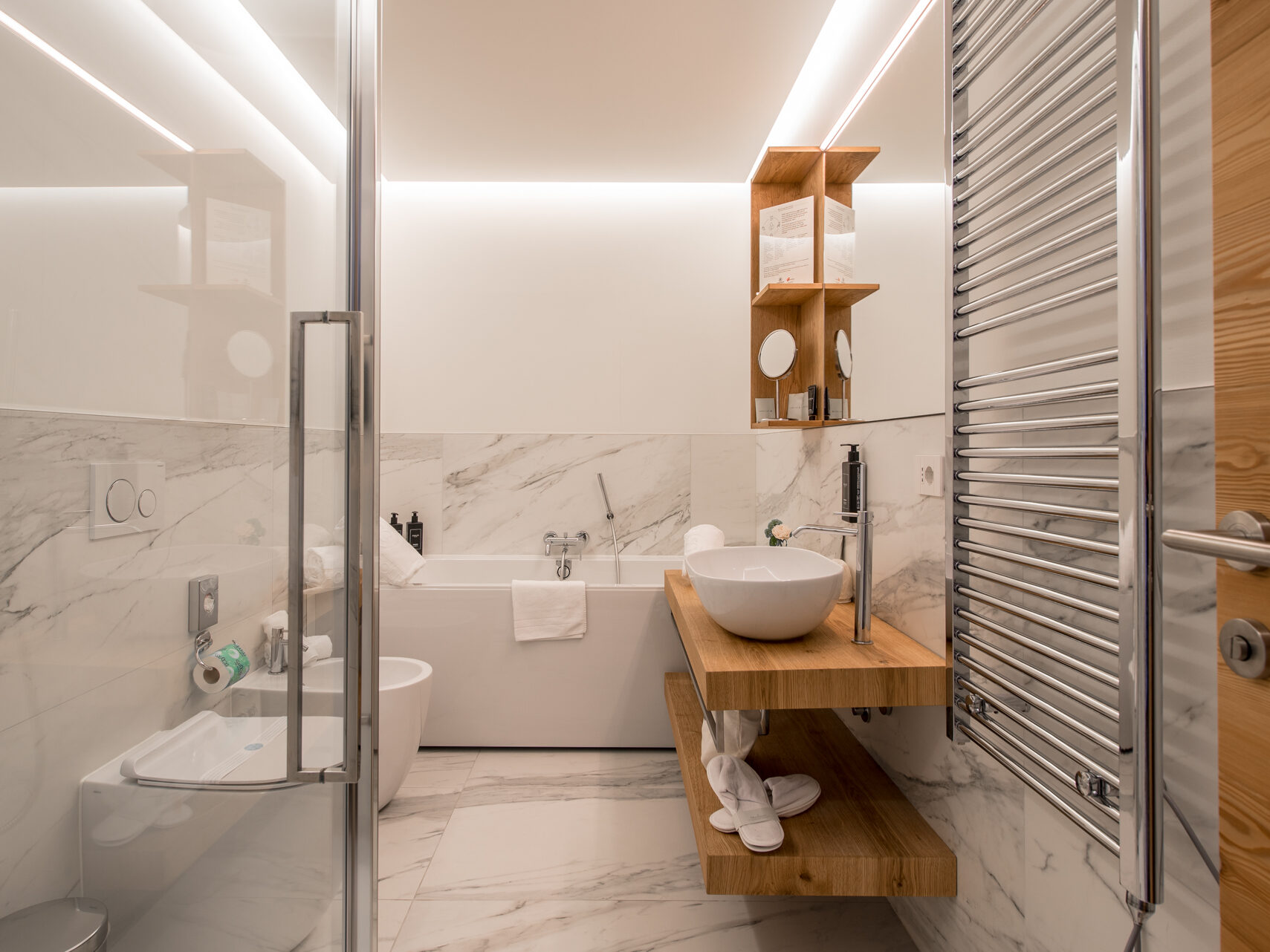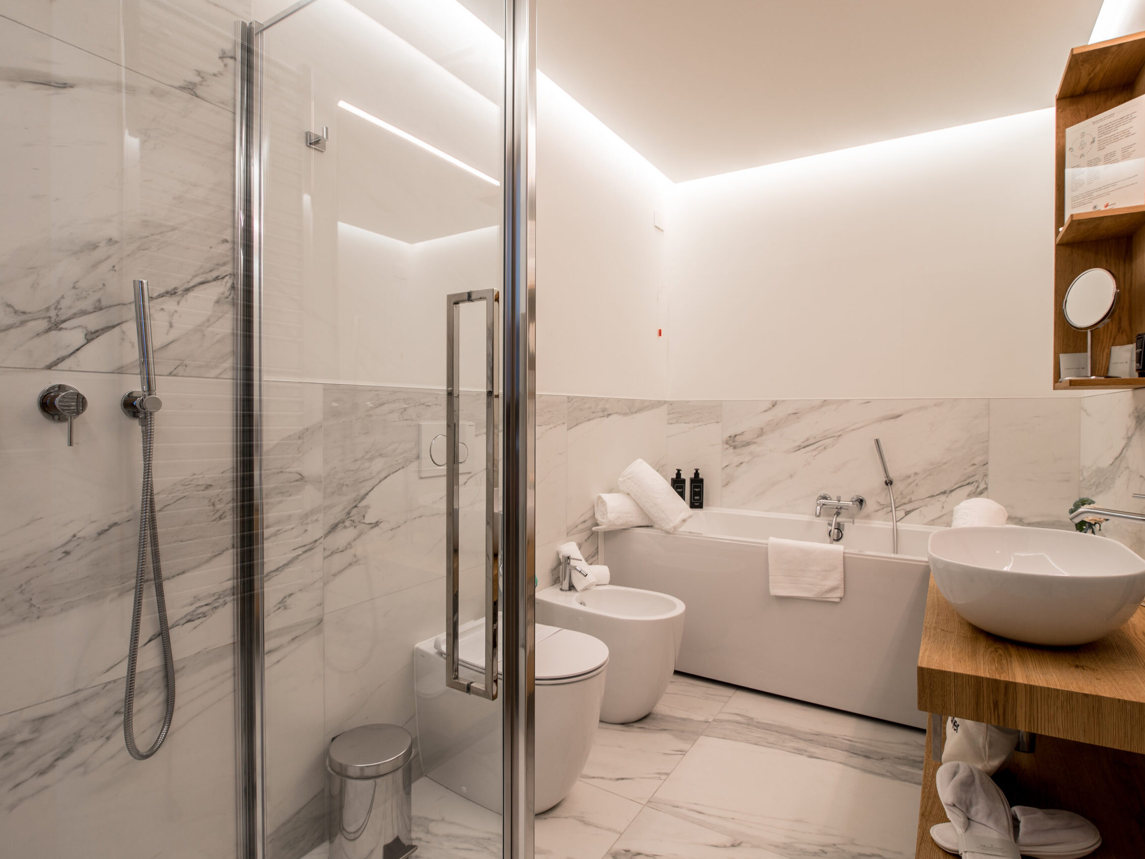 Spaziosi bagni dallo stile moderno con vasca e doccia separati, renderanno ancora più indimenticabile il benessere del vostro soggiorno.
