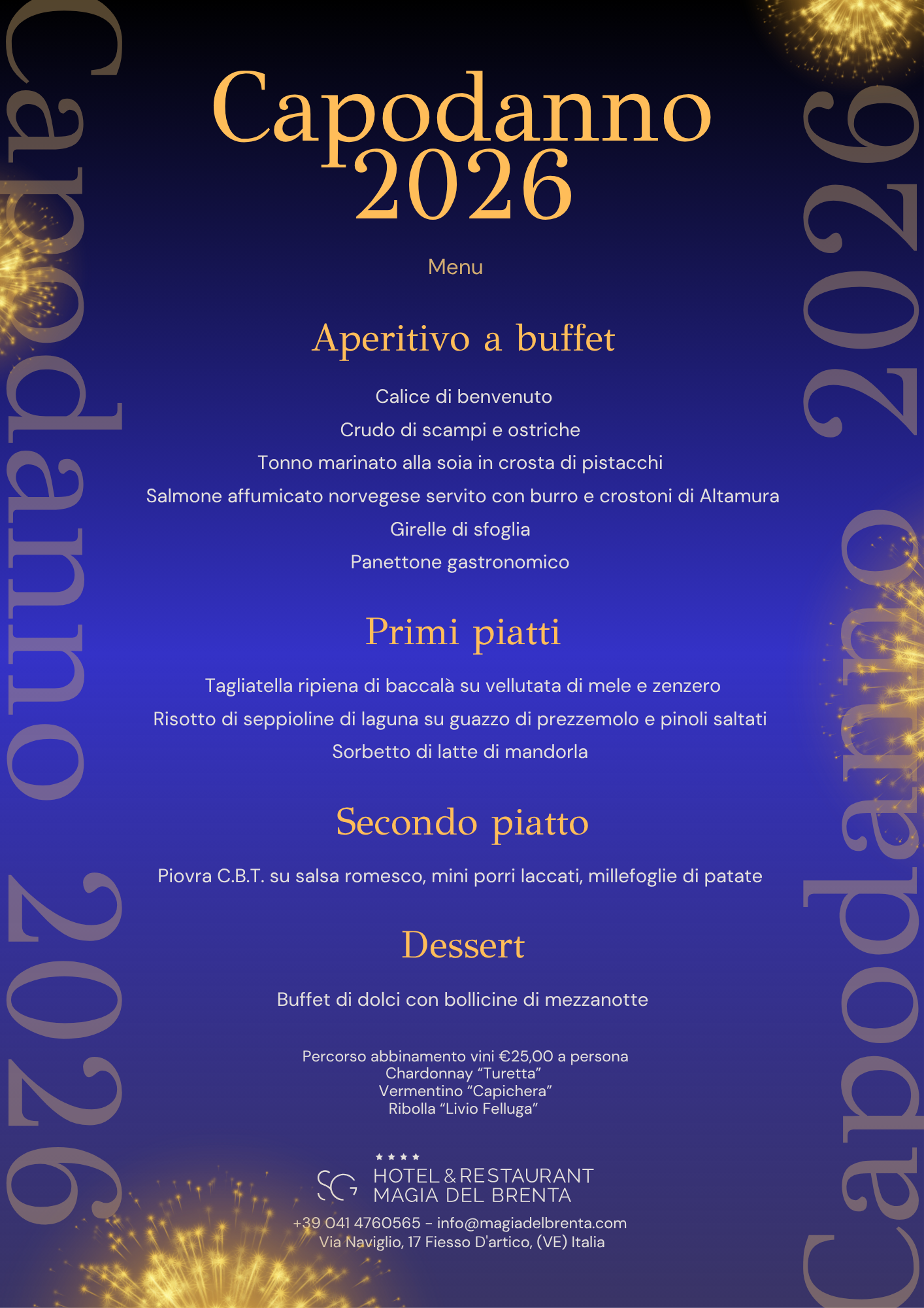L’Hotel & Restaurant Magia del Brenta, a Fiesso d’Artico, ti invita a vivere una notte di Capodanno indimenticabile, dove ogni dettaglio è pensato per farti iniziare l’anno nel modo migliore.